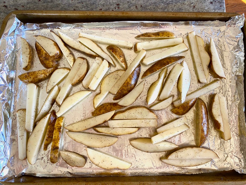 Preheat your oven to 425 F. Cut your potatoes into wedges and spread them out on a sheet tray. Toss them in olive oil, kosher salt, and cracked pepper, and give them a good stir with your (clean) hands to ensure they are evenly coated.